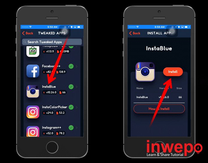 4. Cari Insta Blue – Tap Install – akan muncul pesan, Tap Install lagi. Tunggu beberapa saat hingga proses instalasi aplikasi Insta Blue selesai.