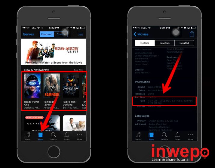 3. Pilih menu Film – cari Film yang file-nya lebih besar dari kapasitas Storage & iCloud Usage.