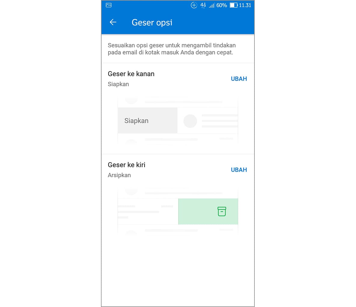 5. Secara default, menu swipe Outlook Mail adalah diarsipkan untuk geser ke kiri dan siapkan untuk geser ke kanan.