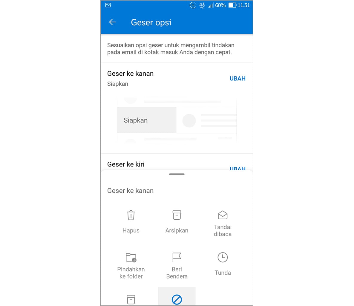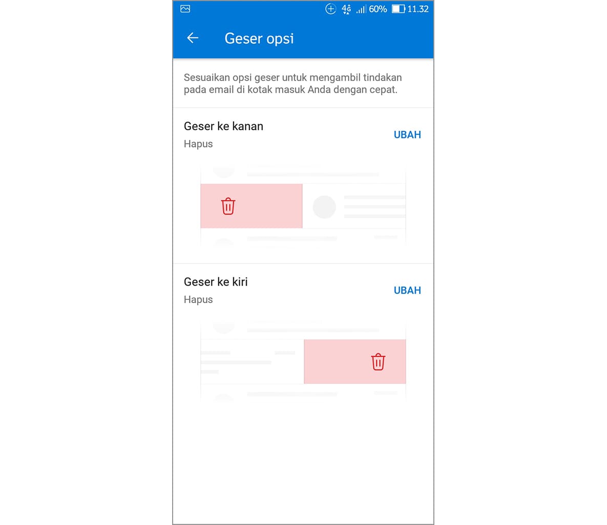 6. Pada tutorial kali ini, tindakan geser yang akan diubah adalah tindakan geser ke kanan dan ke kiri yang berupa penghapusan. Untuk mulai mengubahnya, silakan ketuk ubah.