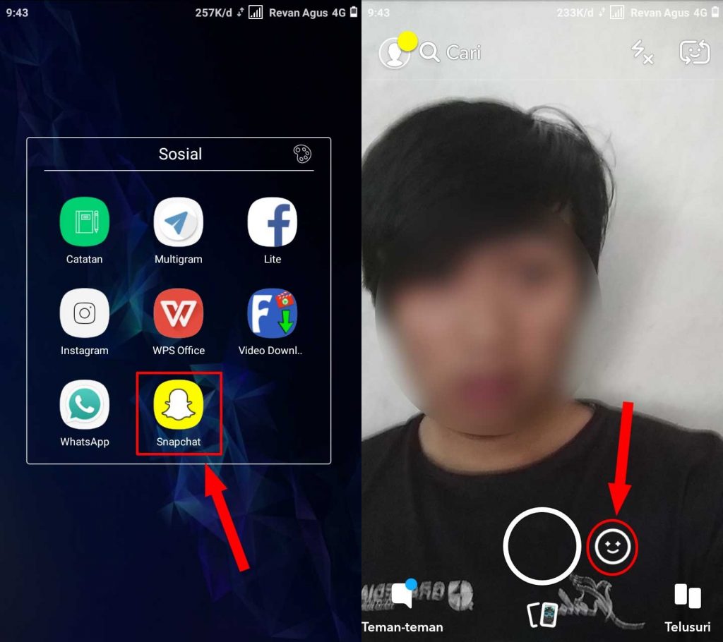 Langkah kedua, buka aplikasi Snapchat lakukan pendaftaran terlebih dahulu untuk yang belum punya akun atau yang sudah punya bisa langsung login menggunakan email masing-masing. Selanjutnya tap pada icon smiley untuk mengaktifkan efek photo yang ada di Snapchat.