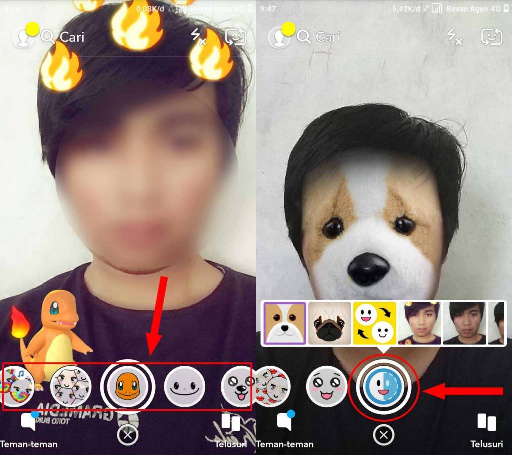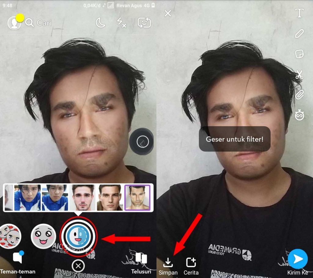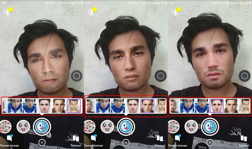 Langkah keempat, kamu bisa download dulu foto wajah artis atau siapa saja setelah tersimpan di galeri foto tadi akan langsung tersinkron dengan aplikasi Snapchat. Tap pada wajah yang ingin digunakan nanti hasilnya kurang lebih seperti berikut ini: