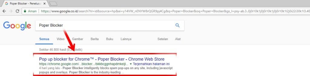 Langkah 1. Buka Chrome – ketik di kontak pencarian ‘Poper Blocker‘ lalu Enter