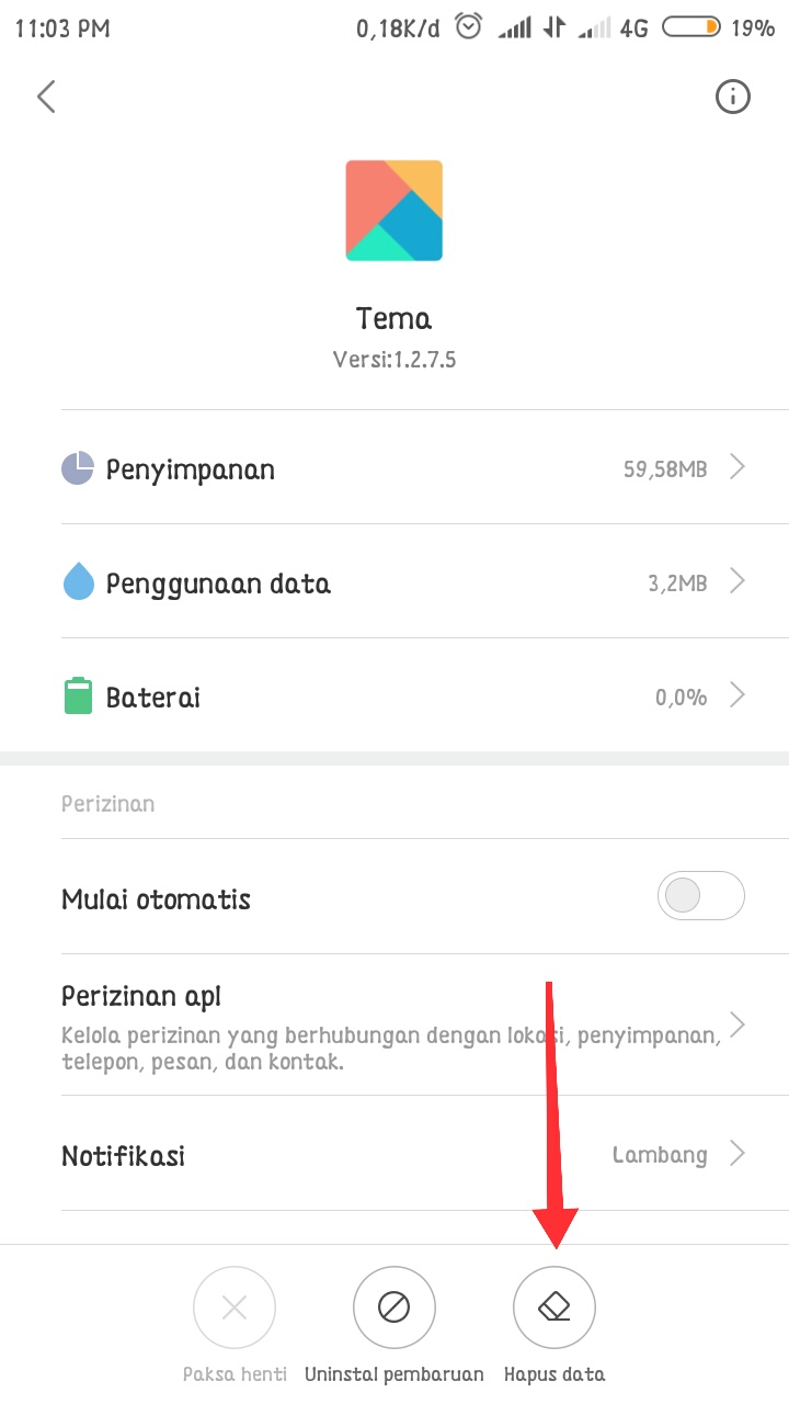 5. Pilih dan Tap tema (theme) – kemudian scroll pada bagian bawah dan pilih hapus data (clear data) bertujuan untuk mengosongkan data yang disimpan saat lokasi belum diubah menjadi India.