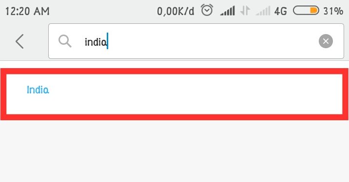 3. Kemudian ubah lokasi yang sebelumnya Indonesia menjadi India. Untuk memudahkan pencarian, ketik India di kolom pencarian.