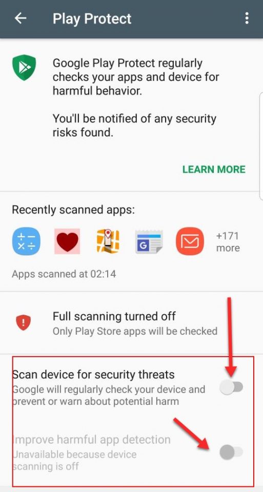 Untuk mengaktifkannya Play Protect silakan tap/geser kembali “Scan device for security threats” dan “improved harmful app detection” hingga tidak terlihat tulisan Full scanning turned off.