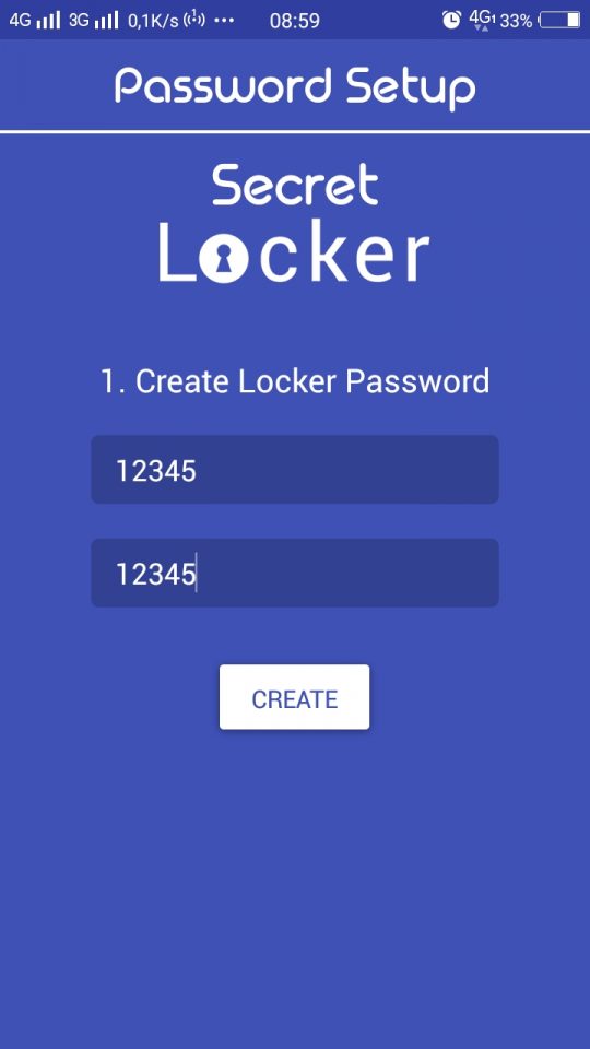 2. Membuat password. Setelah download aplikasinya dan dibuka, kemudian terlebih dahulu membuat password dengan memasukkan password yang diinginkan dan tap CREATE.