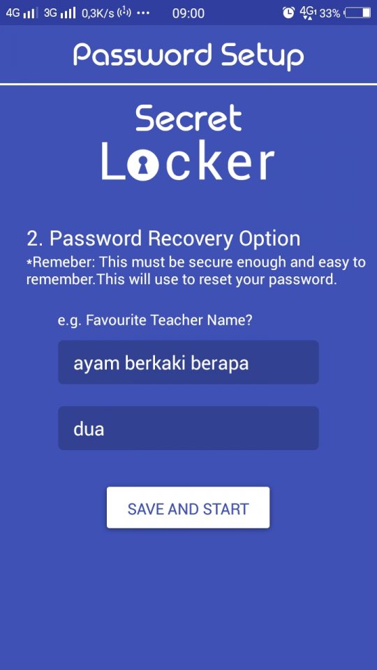 3. Memasukkan Pertanyaan Keamanan. Langkah kedua, kita hanya membuat pertanyaan dan jawaban yang bisa kita ingat jika nanti lupa password, kemudian tap SAVE AND START.
