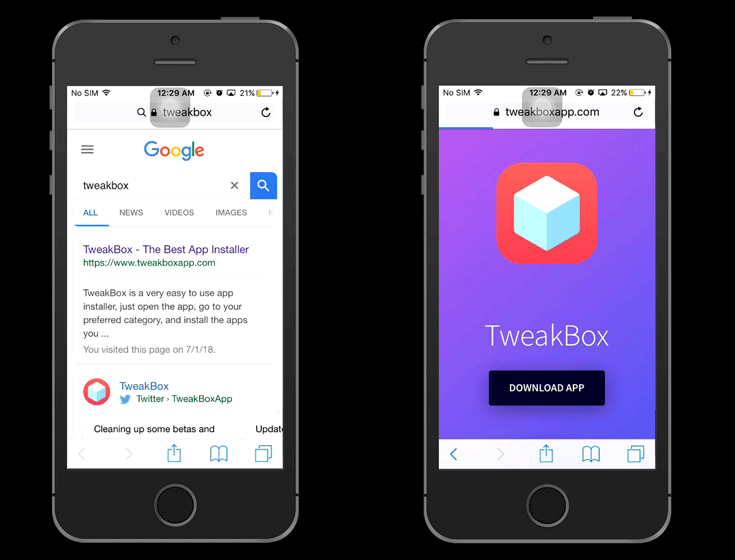 1. Buka browser Safari – kunjungi situs resmi “tweakbox” di www.tweakboxapp.com – tap “download app”.