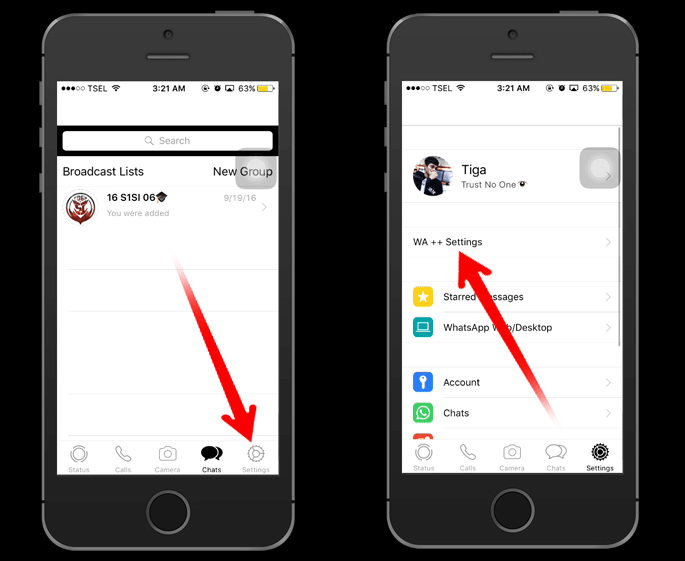 5. Buka aplikasi “WhapssApp++” – masuk “Pengaturan” – tap menu “WA ++ Setting” – aktifkan“Disable Typing Receipts”.