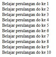 Maksud kode diatas adalah lakukan (do) perintah yang ada didalam selama (while) kondisi berlum terpenuhi ($i <= 10). Hampir mirip dengan perulangan While, dimana didalam kurung While adalah kondisi yang belum terpenuhi ($i <= 10).