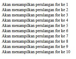 Keluaran dari kode diatas adalah tulisan “Akan menampilkan perulangan for ke 1 sampai 10”. Penjelasan dari statement yang berada di for adalah pertama kita menyatakan nilai dari variabel $i sama dengan 1 ($i = 1). Lalu apabilai nilai dari variabel $i kurang dari sama dengan 10 ($i <= 10), maka perulangan akan terus berjalan. Yang terakhir adalah increment variabel $i ($i++), maksudnya setiap perulangan terjadi maka nilai dari variabel $i ditambah 1.