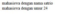 Array asosiatif adalah array yang variablenya memiliki key. ‘nama’ dan ‘umur’ adalah key sedangkan ‘satrio’ dan ’24’ adalah value, dimana $key berada sebelum tanda panah – dan $value berada setelah tanda panah -. Perulangan foreach diatas artinya merubah variabel $contoh menjadi $key dan $value. Lalu tampilkan dengan perintah echo.