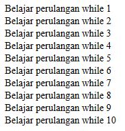 Hampir sama seperti perulangan for, yaitu adanya inisialisasi variabel $i=1, lalu adanya kondisi $i <= 10, dan juga increment $i++. Yang membedakan adalah tata letak penempatannya. Outputnya berupa kalimat “belajar perulangan while 1 sampai 10”.