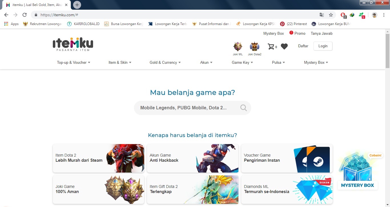 Situs itemku.com merupakan situs pembelian skin Mobile Legend terpercaya di seluruh Indonesia. Situs ini dibangun pada Juli ditahun 2014. Bukan hanya skin saja, situs ini juga melayani pembelian diamond Mobile Legend dan penjualan akun Mobile Legend dengan tier rank yang kamu mau. Bukan hanya pembelian skin dan diamond Mobile Legend saja, situs itemku juga melayani pembelian akun dengan pembayaran melalui mini market terdekat, pulsa telkomsel, pulsa 3, pulsa xl, pulsa indosat, Ovo dan online banking.