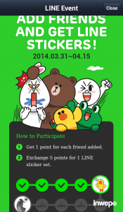 Hari ini 31 maret 2014 LINE mengadakan event terbaru untuk mendapatkan 5 stiker LINE gratis dengan syarat tambahkan minimal 5 teman baru yang dapat ditukaran 1 buah stiker LINE messenger gratis.