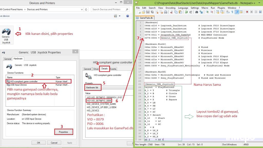 Sebelum mendeteksi gamepadnya, perlu diketahui dulu file database dari gamepad Bluestacks, filenya bernama GamePads.db, lokasinya di C:Documents and SettingsAll UsersApplication DataBluestacksUserDataInputMapper untuk WinXP, dan C:ProgramDataBluestacksUserDataInputMapper untuk Win7 & 8, disini jg ada file2 .cfg dari masing-masing game yg berisi data-data tombol keyboard ataupun gamepad.