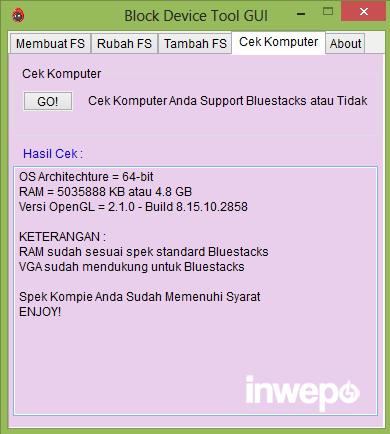 Dengan menggunakan bantuan aplikasi Block Device Tool (BDT) berfungsi untuk mengelola Data/SDCard. Tools ini juga bisa untuk mengecek VGA sudah kompatibel sama Bluestacks, sebelum melakukan cek VGA, pastikan driver VGA-nya sudah diperbarui.