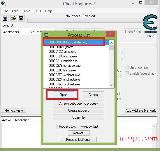 3. Klik process to open (icon komputer), lalu pilih address dengan nama [Physical Memory] biasanya atas sendiri dengan alamat 00000000.