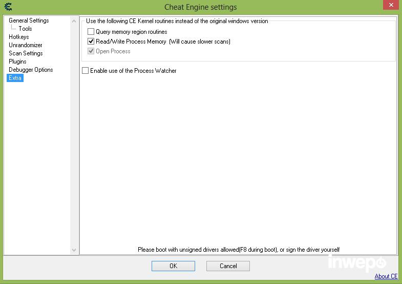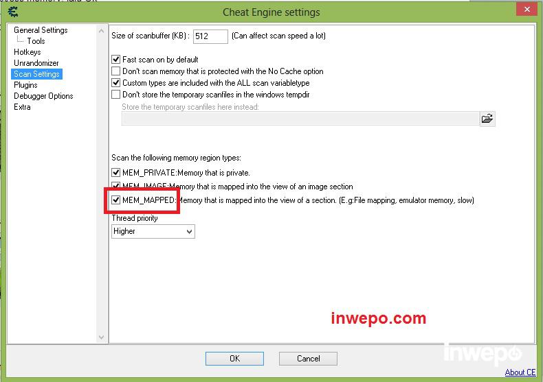 2. Jalankan aplikasiĀ Cheat Engine, lalu pilih tab edit ā setting, pilih scan setting dan centangĀ MEM_MAPPED, lalu pilih extra dan centang Read/Write Process memoryĀ dan Ok.