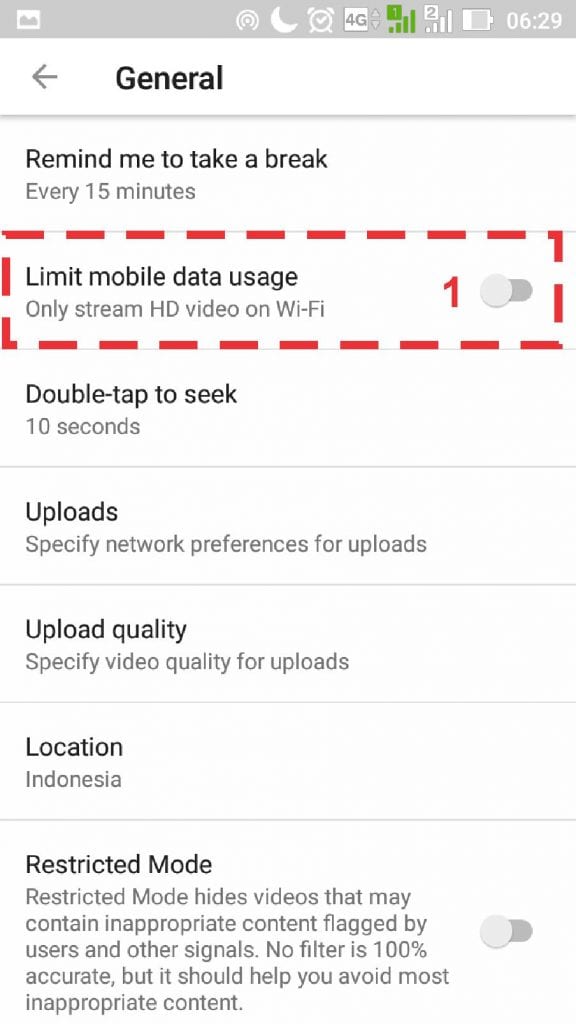 4. Pada sub menu general, aktifkan pengaturan limit mobile data usage. Sehingga ketika kamu menonton Youtube menggunakan kuota internet, kuota yang dikeluarkan akan lebih sedikit karena video yang ditampilkan tidak HD.