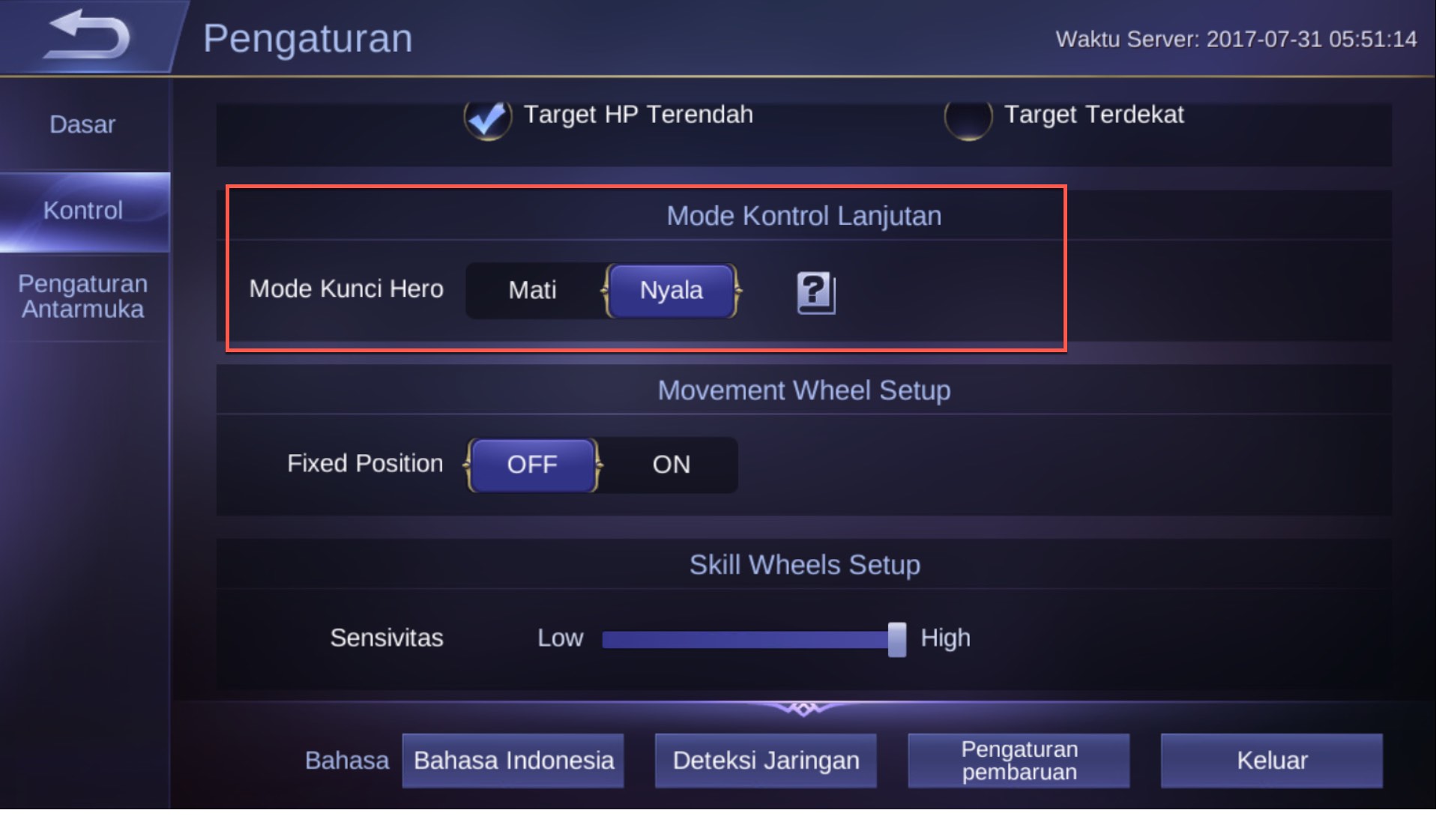 3. Setelah masuk ke pengaturan, geser ke bawah lalu aktifkan Mode Kunci Hero menjadi Nyala.