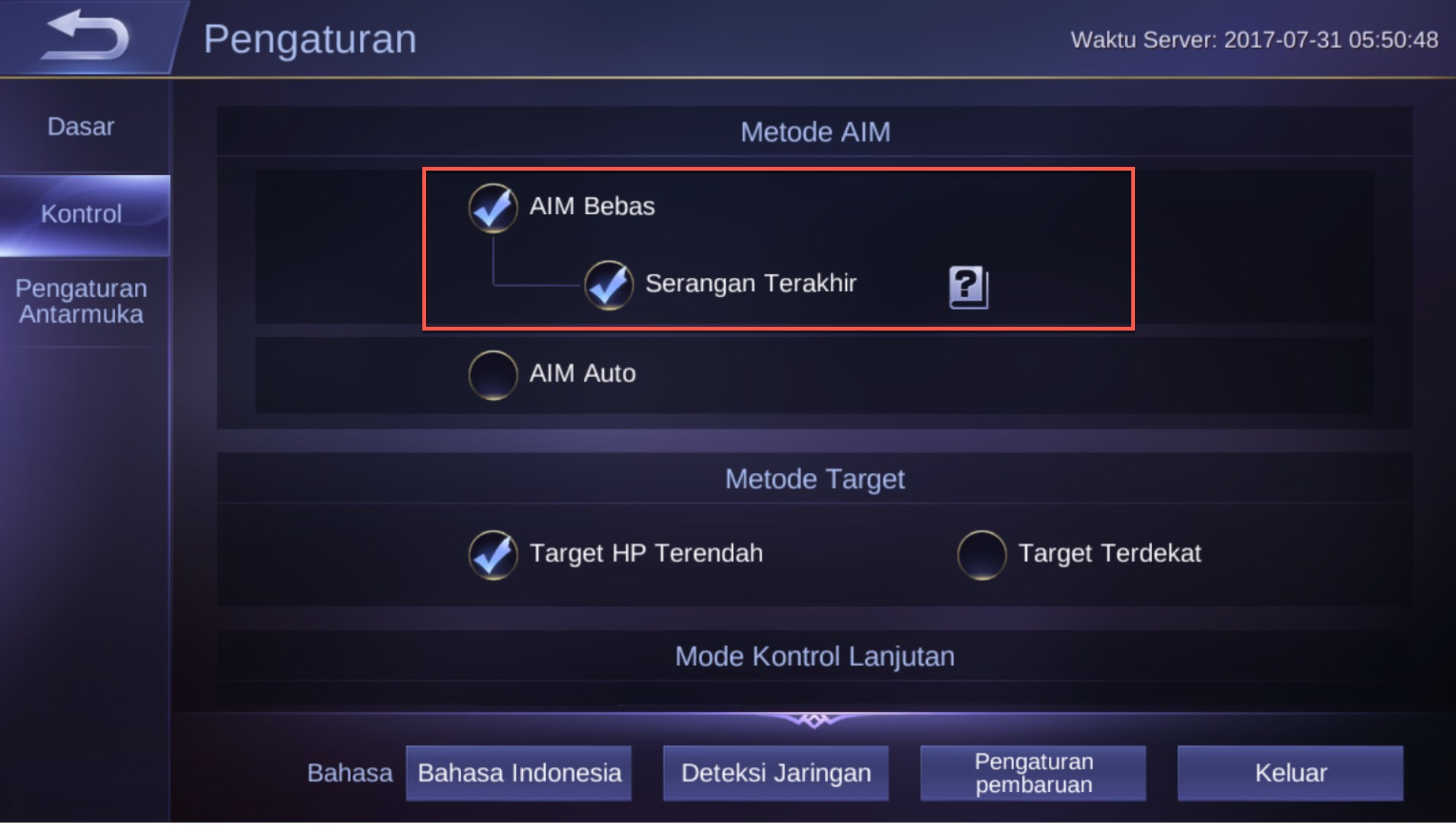 4. Adapun pengaturan mode Serangan Terakhir, jika di centang maka akan menampilkan icon serangan tower dan monster hutan (minion). Fitur ini berguna pada saat kita ingin menargetkan serangan ke tower atau minion agar tidak berubah penyerangannya.
