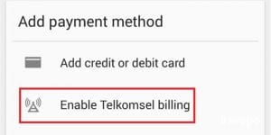 4. Pilih opsi payment methods. (Aktifkan carrier billing, sesuai kartu yang digunakan misal telkomsel, indosat atau xl).