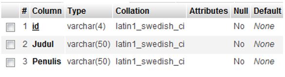2. Membuat struktur table buku seperti dibawah ini: