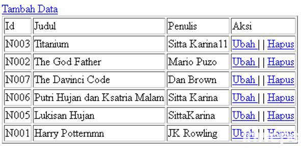 <html> <head> <title>Contoh Input</title> </head> <body> <h2><?php echo $title ?></h2> <a href="<?php echo base_url().'showbuku/input';?>">Tambah Data</a> <table border = 1> <tr> <td>Id</td> <td>Judul</td> <td>Penulis</td> <td>Aksi</td> </tr> <?php foreach ($buku as $b): ?> <tr> <td><?php echo $b->id ?></td> <td><?php echo $b->Judul ?></td> <td><?php echo $b->Penulis ?></td> <td><?php echo anchor('showbuku/edit/'.$b->id, ' Ubah ') . '| | ' . anchor('showbuku/delete/'.$b->id, ' Hapus '); ?> </td> </tr> <?php endforeach ?> </table> </body> </html>