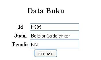 <html> <head> <title>Data Buku</title> </head> <body><center> <h2>Data Buku</h2> <form action= "<?php echo base_url().’showbuku/tambah’ ?>" method="post"> <table> <tr> <th>Id</th> <td><input name="id" type="text"></td> </tr> <tr> <th>Judul</th> <td><input name="Judul" type="text"></td> </tr> <tr> <th>Penulis</th> <td><input name="Penulis" type="text"></td> </tr> </table> <input type="submit" value="simpan" /> </form> </body> </html>