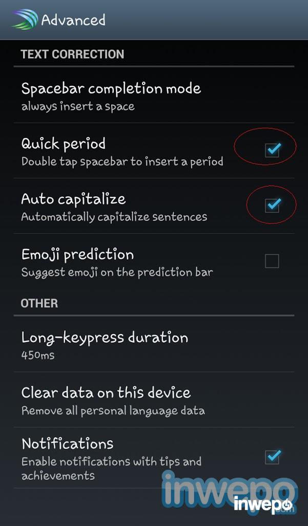 2. Kemudian centang Quick period dan Auto capitalize. dan pilih menu Spacebar completion mode “Always insert a space”.