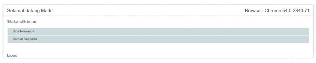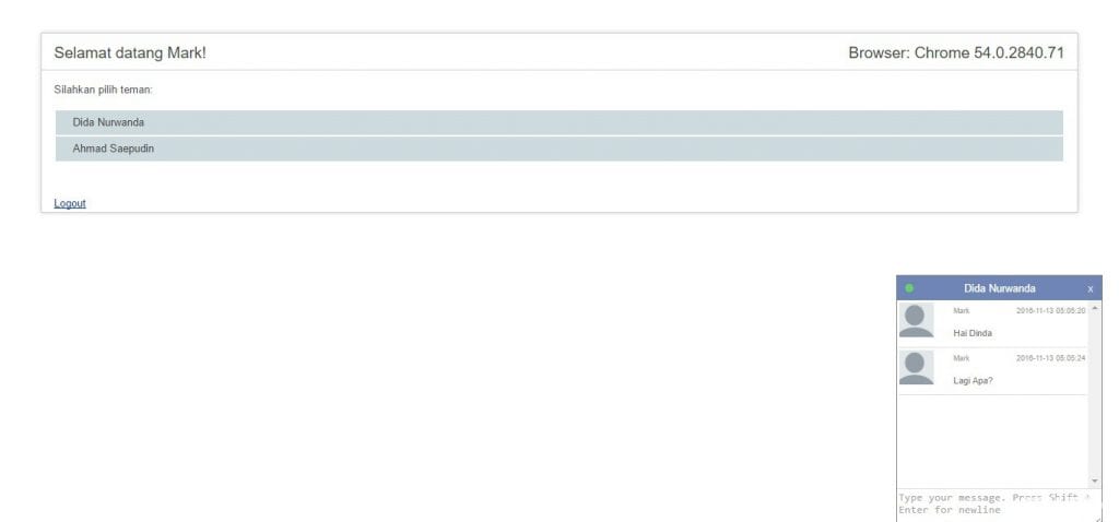 Pilih teman untuk diajak chatting dengan meng-klik nama teman Anda, kemudian akan muncul kotak dialog untuk memulai percakapan seperti gambar dibawah ini:
