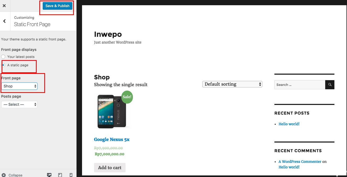 Agar list produk yang kita jual terdapat di halaman utama, kamu perlu mengubah default pengaturan awal static front page halaman, caranya: