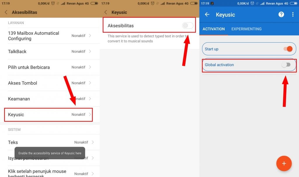 Langkah ketiga, selanjutnya kamu akan di bawa ke menu Aksebilitas, pilih Keyusic lalu geser tombol Aksebilitas ke kanan untuk mengaktifkan. Bila sudah kembali lagi ke layar awal dan aktifkan Global Activation.