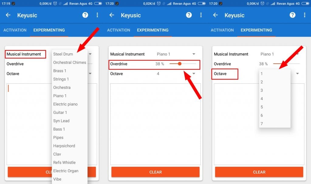 Langkah keempat, tap ke menu sebelah kanan yakni EXPERIMENTING, selanjutnya tap Musical Instrument untuk mengganti jenis alat musik. Pilih juga Overdrive untuk mengatur Overdrive dari 0 hingga 100%. Terakir atur oktaf dengan tap pada menu Octave atur mulai 1 hingga 7.