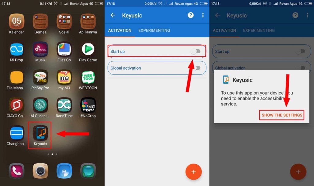 Langkah kedua, setelah selesai terinstall dengan baik di smartphone buka aplikasi Keyusic. Pada menu Activation aktifkan tombol Start up nanti akan muncul pop up, Pilih SHOW THE SETTINGS.
